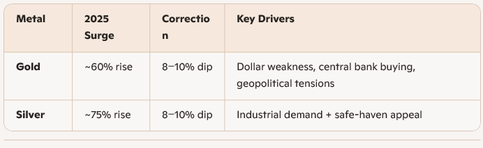 Despite the bullish run, October 2025 witnessed a correction of nearly 8–10% in both metals. Optimism around easing trade tensions and progress in peace talks temporarily reduced safe-haven demand. However, analysts viewed this dip as a healthy correction rather than a reversal.